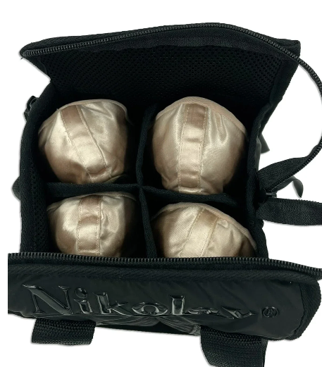 Practical pointe shoe bag designed to organize and protect your footwear. It features a protective zip lid, four soft internal slots to separate shoes, and a convenient exterior side pocket for quick access to small essentials. Lightweight and durable—ideal for rehearsals and travel.
