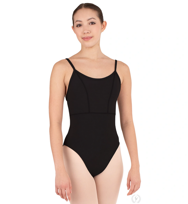 Camisole strap leotard with princess seams that end at the empire waist, scoop front neckline, and moderate scoop back. Details include a higher cut leg line and full front lining.